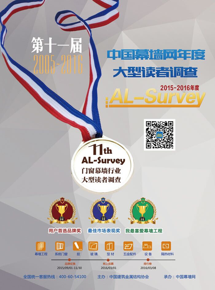 ????? “AL”是鋁門(mén)窗幕墻委員會(huì)aluminum的英文開(kāi)頭首母,“AL”還代表鋁的元素符號(hào),同時(shí),“AL”是中國(guó)幕墻網(wǎng)域名ALwindoor的簡(jiǎn)寫(xiě),“Survey”則代表調(diào)查。